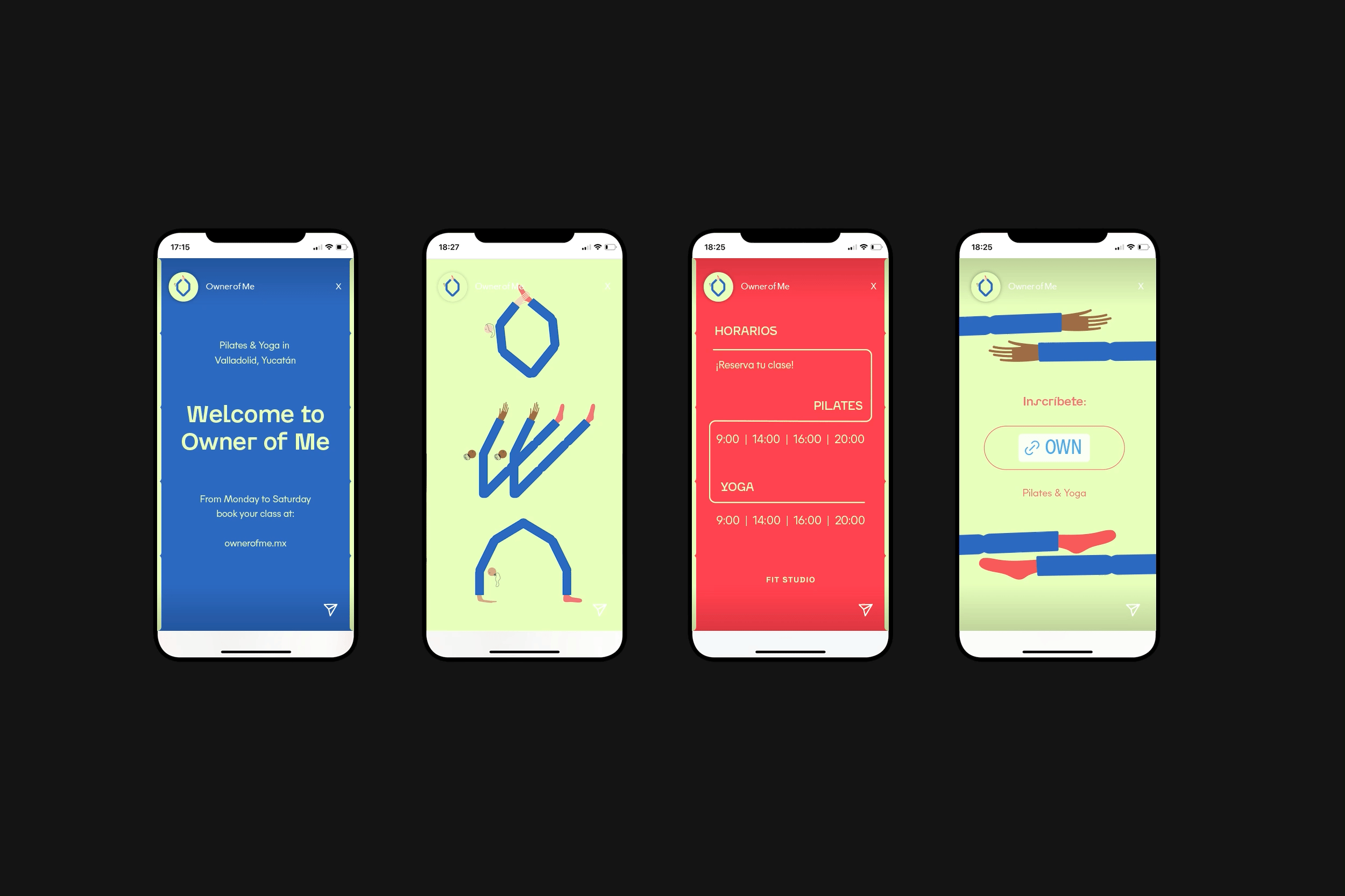 Owner of Me is a Pilates studio located in Valladolid, Yucatán. The brand identity is vibrant and playful, featuring a dynamic logo that incorporates illustrative details to capture the cheerful and welcoming essence of the studio. The color palette used adds freshness and youth.